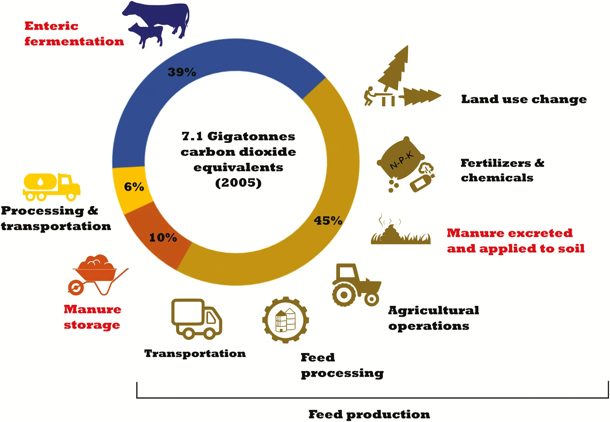 Source: doi.org/10.1093/af/vfy034 | Livestock emissions by source (adapted from Gerber et al., 2013). Direct livestock emissions are shown in red.